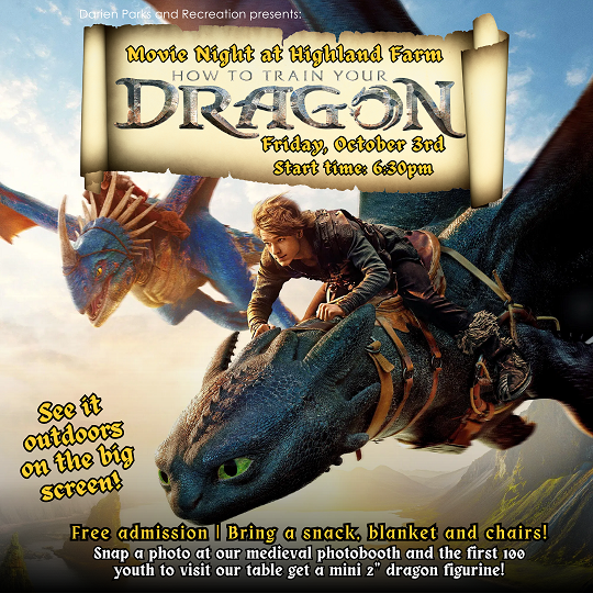 Join Darien Parks and Recreation for a free movie night at Highland Farm on October 3rd at 6:30pm – Join us for a free showing of the 2025 version of How to Train Your Dragon! Join us with your friends and family, a picnic dinner, blankets and chairs. Mister Softee will be on-site and the movie starts at 6:30pm/when dark enough to start. Stop by our table for a small promo giveaway while supplies last! All attendees are asked to carry out what they carry in (trash/garbage) and are encouraged to bring a flashlight.